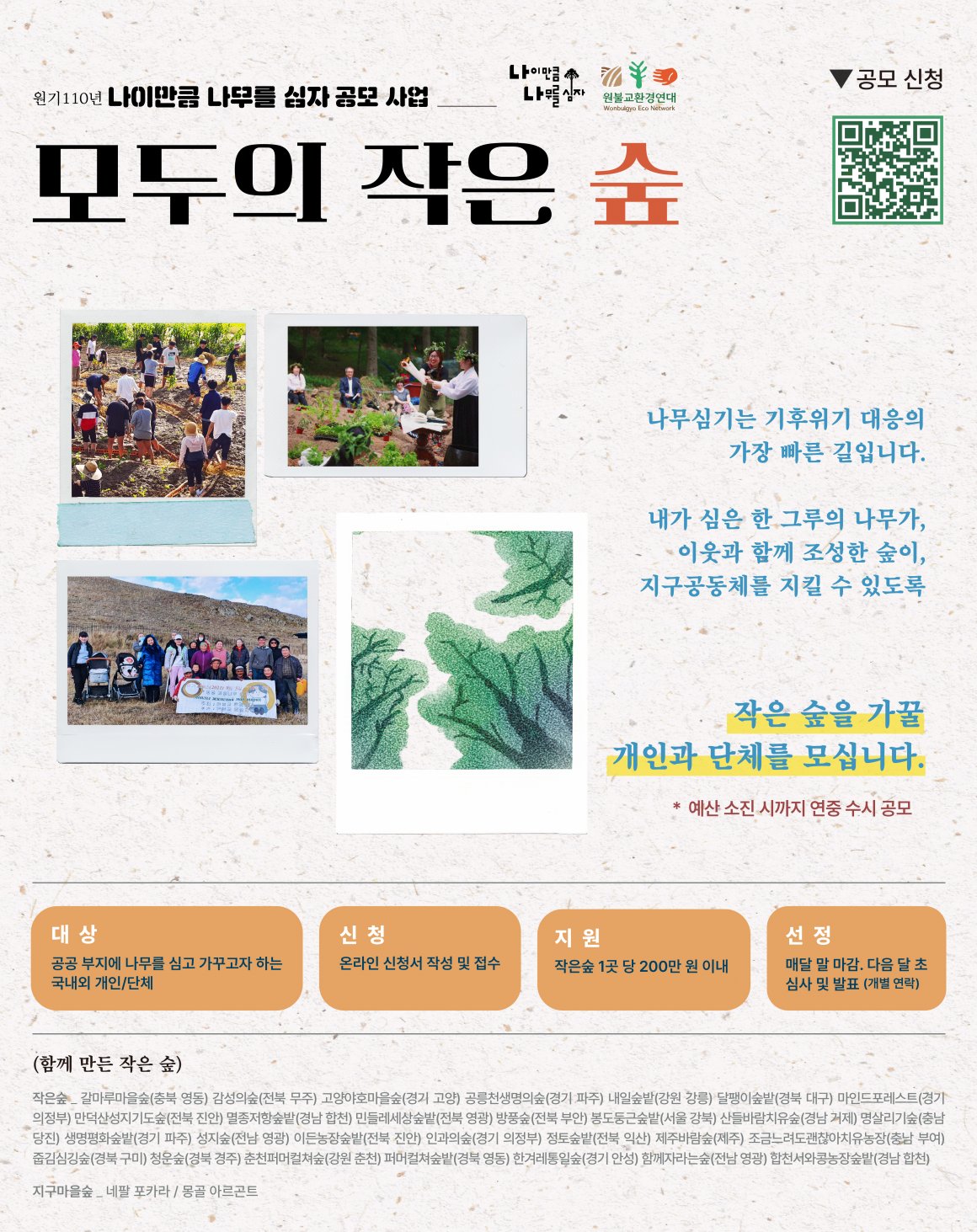 봄, 가을에 진행해온 작은 숲 공모를 올해부터 수시 진행합니다. 해외를 포함해 30여 곳의 '작은 숲'을 만들어온 기후행동에 함께 하고자 하는 나무지킴이 여러분의 많은 관심과 지원 바랍니다.