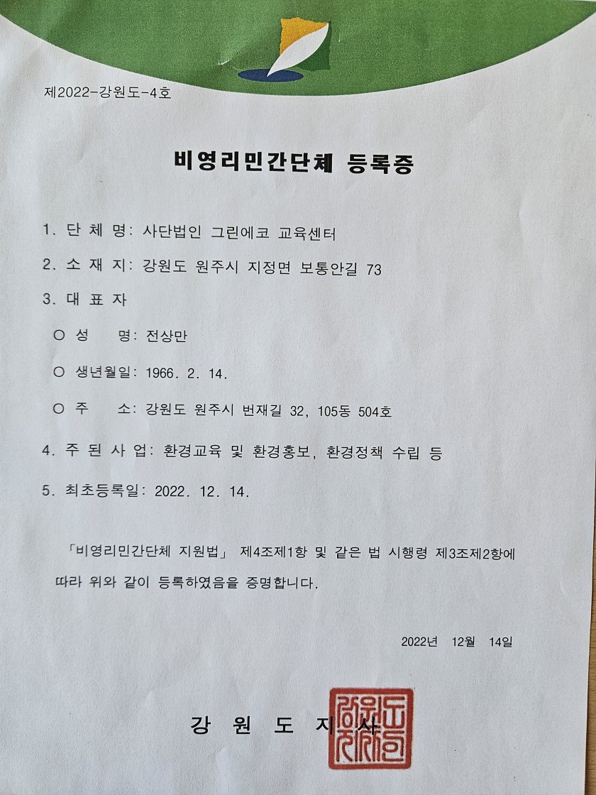 ◦ 2023. 12. 29 한강유역 환경교육 공로 강원도지사 표창